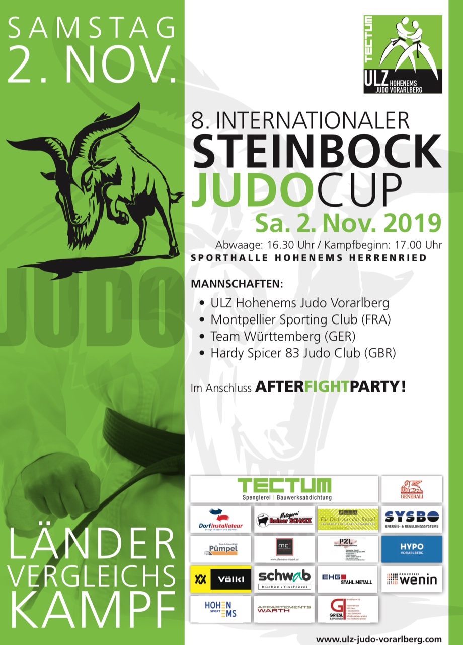 In diesem Jahr Jahr findet bereits der 8. Internationale Steinbock Judo Cup in der Hohenemser Herrenriedhalle statt. Diesmal haben sich Mannschaften aus Großbritannien,Frankreich und Deutschland angekündigt, um mit dem Team des ULZ um die Steinbockcup Trophäe zu kämpfen. Der Titelverteidiger aus Vorarlberg steht heuer mehreren hochkarätigen Mannschaften gegenüber. Dieses Jahr wird zum ersten Mal im Mixed Bewerb gekämpft. 3 Herren und 2 Damen pro Team werden sich im internationalem Format messen und um die Trophäe kämpfen. Wir freuen uns über tolle Kämpfe und viele sportbegeisterte Zuschauer in der Halle. LZ-IPPON!